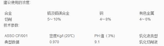 ASSO CF/001 是一种水溶性切削液,采用高度精制矿物油为基础油,内含合成脂肪酸及其它添加剂,具有抗蚀、防锈、防止刀具粘结等优点。