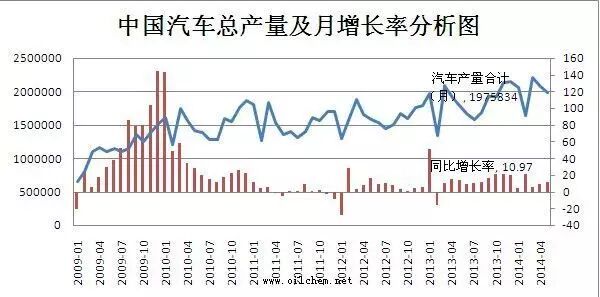 车用润滑油需求来看,民用汽车保有量逐年递增,稳定了车用油的需求量。从汽车行业的数据得知,中国每年2000万辆汽车销售量,使中国保有量5年实现翻番,保证了润滑油需求处于大规模稳定成长期。2013年汽车销售总量超过2100万辆,使中国汽车保有量达到1.3亿辆。2014年1-5月份的汽车总产量在9934280量。